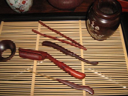 Teetisch, Teebesteck, Duftbecher und Trinkschale auf Rosenholzuntersetzern,